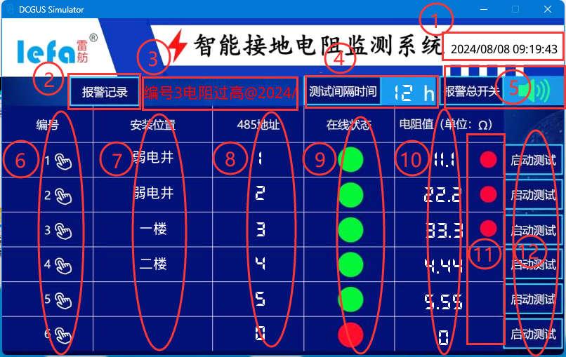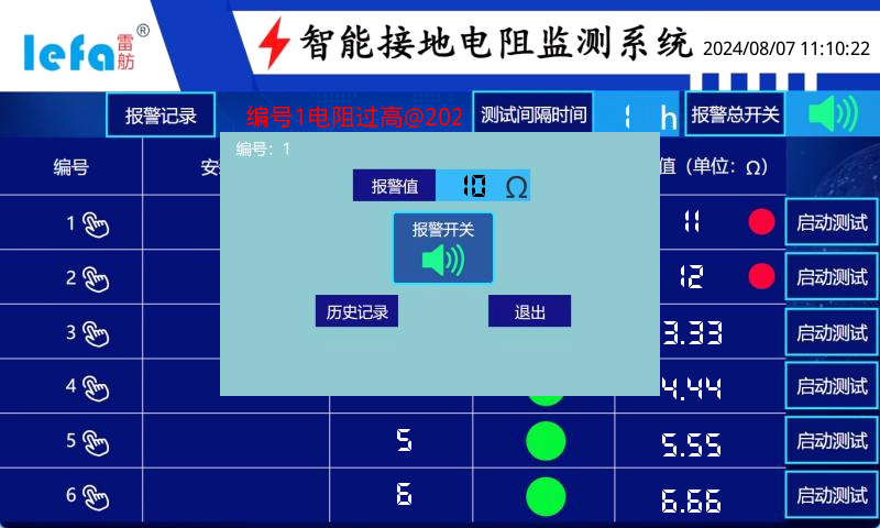 2.报警记录:记录各设备报警信息,最多记录10000条。支持掉电存储、usb导出数据。当监测的接地电阻值大于或等于预设的报警阈值时,触摸屏将在③处显示报警信息,以警示操作人员注意,并同步触发声光警报。可点击⑤报警总开关关闭声音警报。(报警值默认为10Ω,可在⑥处对各个设备进行单独设置)