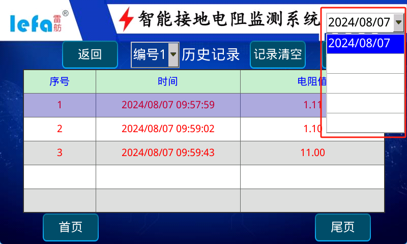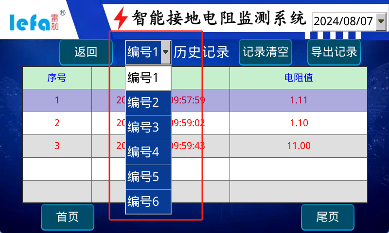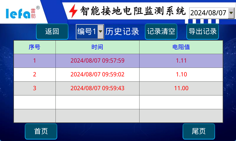历史记录:当监测的接地电阻值发生变动时,变动的数据将记录下来。可了解接地电阻值的变化趋势,每个设备最多记录1000条,支持掉电存储、usb导出数据。(注:空测及超量程溢出,所记录的电阻值为“10000”)