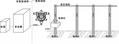 若地网A、地网B之间若没有架空线,在地面上没有连接在一起,则地网A、地网B为独立的单点接地。则监测仪不能直接测试单点接地系统的接地电阻值,会显示“OL”溢出符号,表示超出监测仪的上量限。此时需要增加一个或两个辅助地极,构成回路,再安装监测仪。对于近距离内有2个或2个以上的单点接地系统,可以将各单点接地系统的接地引下线在地面上用金属导体连接起来,形成回路,再安装本监测仪监测。