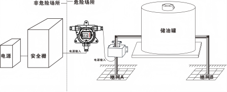 如图:回路电阻包括A点对地的接地电阻值、接地引下线金属导体的阻值、金属架空线的阻值、接地引下线与金属架空线之间的连接电阻值(接触电阻)、B点对地的接地电阻值的综合值。对形成上述回路的接地系统,可以直接安装监测仪监测,若没有形成回路的接地系统,需要增加辅助接地极使其形成回路,再安装监测仪,见后述单点接地系统。