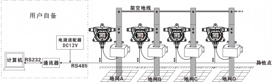 有线网络系统通过RS485通讯方式传输数据,由监测仪、监控软件、【通讯器、电源适配器、电脑(以上须用户自备和二次开发)】等组成,适合于1500米近距离接地电阻监测。