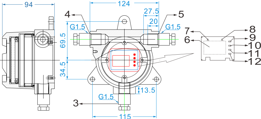 3、电源、RS485通讯进线孔 4、监测仪进线孔