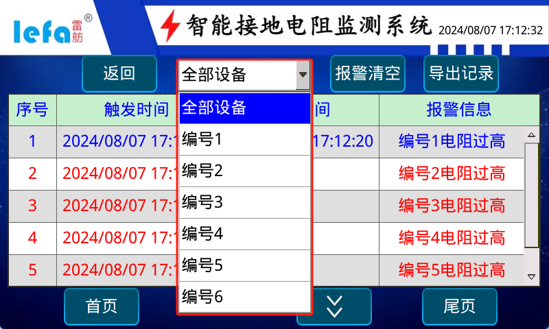 2.报警记录:记录各设备报警信息,最多记录10000条。支持掉电存储、usb导出数据。当监测的接地电阻值大于或等于预设的报警阈值时,触摸屏将在③处显示报警信息,以警示操作人员注意,并同步触发声光警报。可点击⑤报警总开关关闭声音警报。(报警值默认为10Ω,可在⑥处对各个设备进行单独设置)