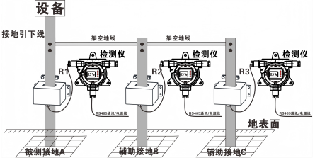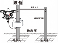 如图:回路电阻包括A点对地的接地电阻值、接地引下线金属导体的阻值、金属架空线的阻值、接地引下线与金属架空线之间的连接电阻值(接触电阻)、B点对地的接地电阻值的综合值。对形成上述回路的接地系统,可以直接安装监测仪监测,若没有形成回路的接地系统,需要增加辅助接地极使其形成回路,再安装监测仪,见后述单点接地系统。